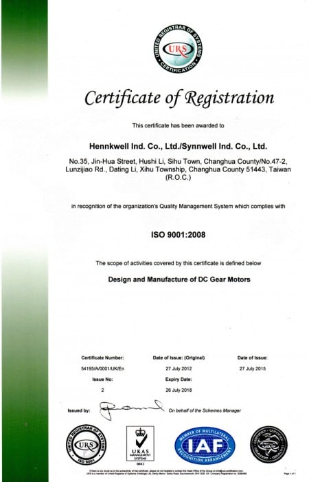 2012/07/27 HennkwellHennkwell on ISO9001-sertifioitu yritys, ja noudatamme järjestelmää tiukasti varmistaaksemme DC vaihteistomoottoriemme laadun.